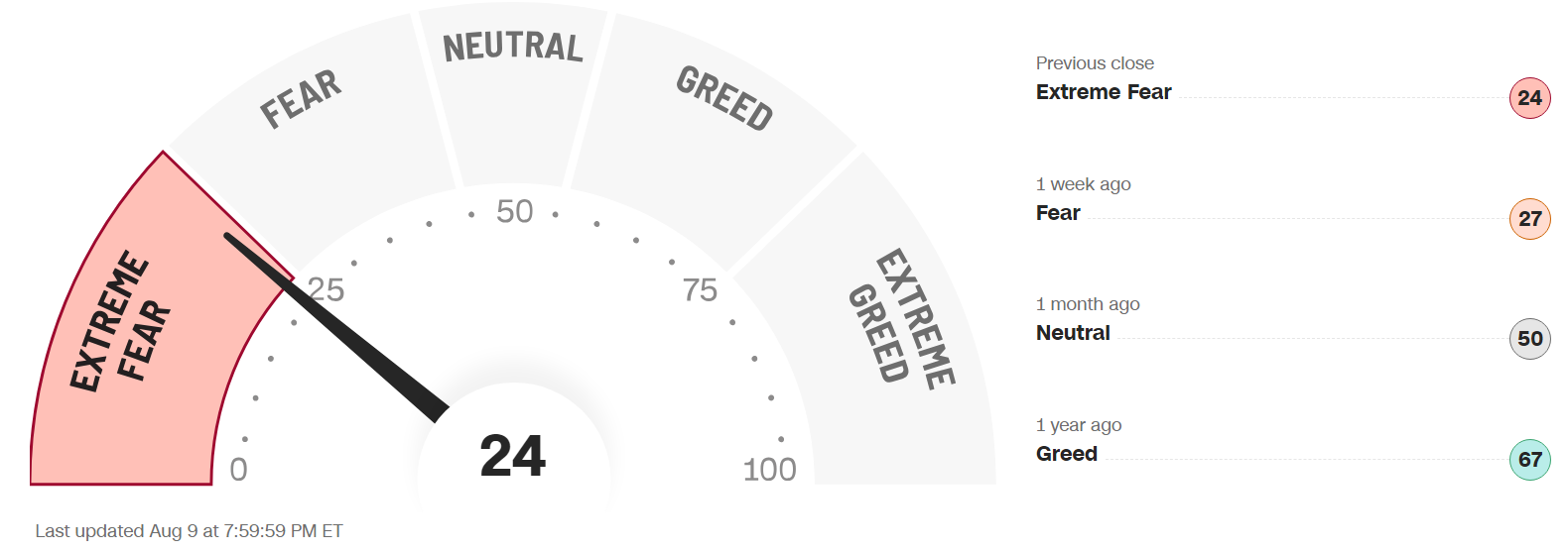 The Fear & Greed Index (found on cnn.com) is one of the easiest indicators to use to determine current market emotion. This simple to read gauge, highlighted in our publication When to Buy and When to Sell: Combining Easy Indicators, Charts, and Financial Astrology - available on Amazon, is measured in a range from 0-100, and currently reads 24 as of the close on Friday, August 9, 2024.