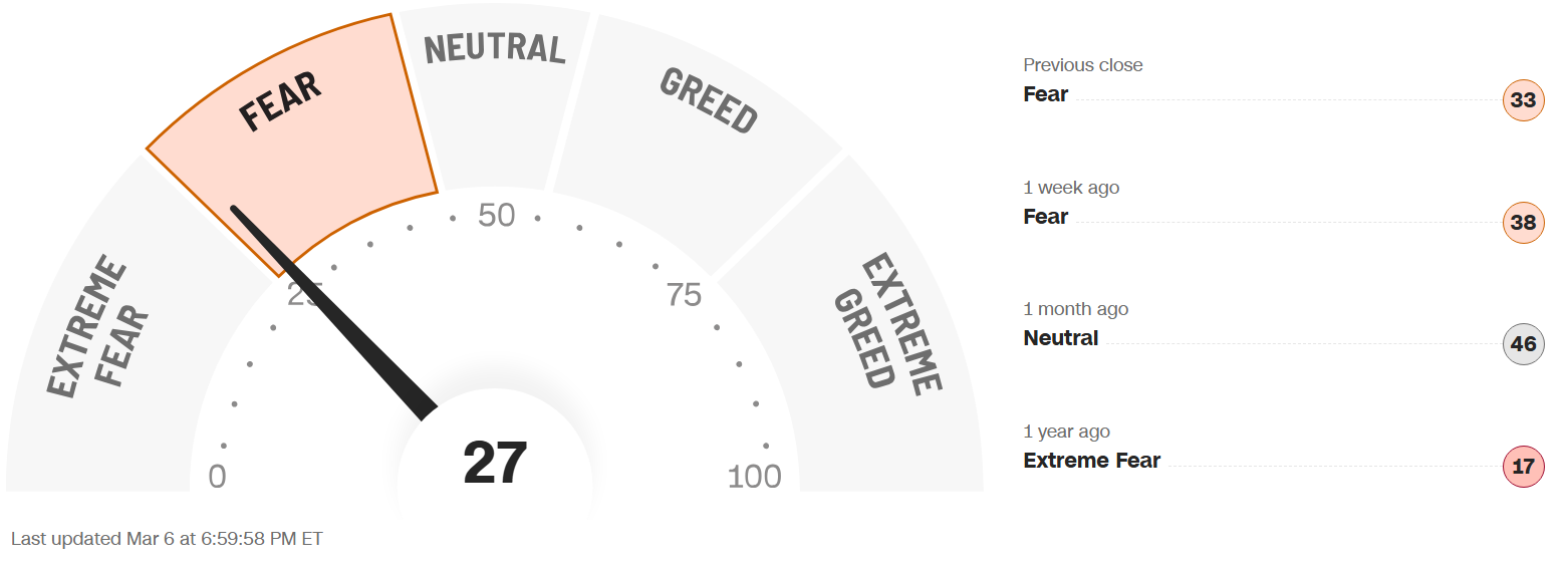 The Fear & Greed Index (found on cnn.com) is one of the easiest indicators to use to determine current market emotion. This simple to read gauge, highlighted in our publication When to Buy and When to Sell: Combining Easy Indicators, Charts, and Financial Astrology (available on Amazon), is measured in a range from 0-100, and currently reads 27 as of the close on Friday, March 6, 2026.