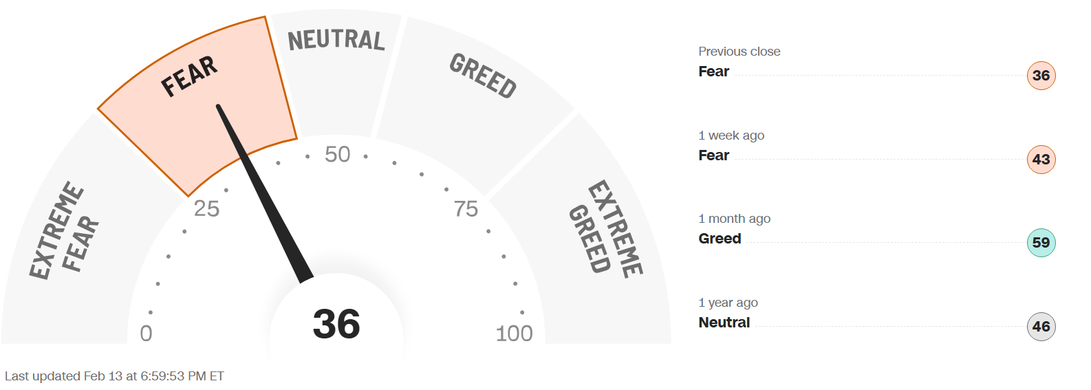 The Fear & Greed Index (found on cnn.com) is one of the easiest indicators to use to determine current market emotion. This simple to read gauge, highlighted in our publication When to Buy and When to Sell: Combining Easy Indicators, Charts, and Financial Astrology (available on Amazon), is measured in a range from 0-100, and currently reads 36 as of the close on Friday, February 13, 2026.
