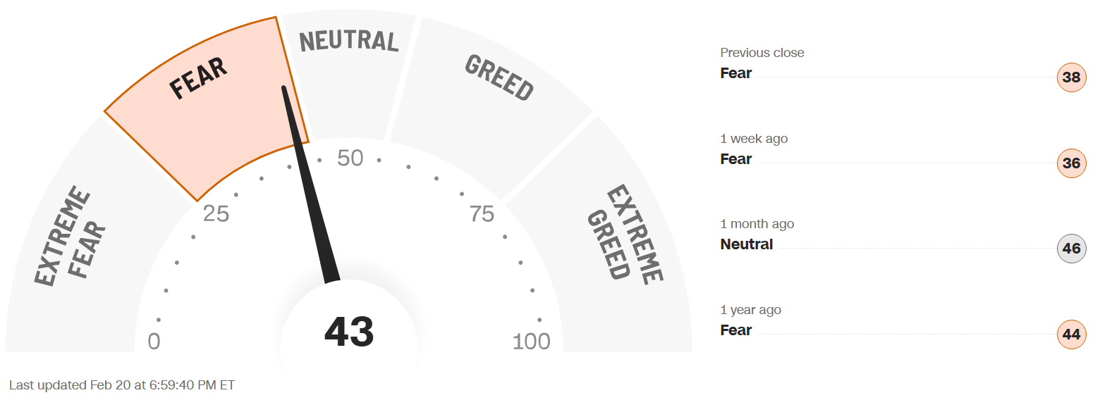 The Fear & Greed Index (found on cnn.com) is one of the easiest indicators to use to determine current market emotion. This simple to read gauge, highlighted in our publication When to Buy and When to Sell: Combining Easy Indicators, Charts, and Financial Astrology (available on Amazon), is measured in a range from 0-100, and currently reads 43 as of the close on Friday, February 20, 2026.